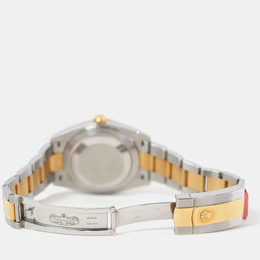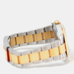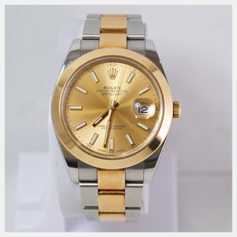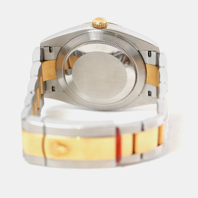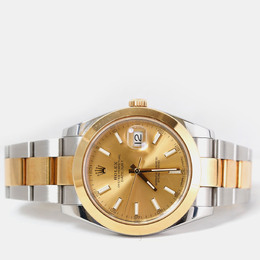 A luxurious men's automatic Rolex Datejust. Crafted from 18K yellow gold and stainless steel, it features a sophisticated champagne dial renowned for its elegance. Equipped with the Calibre 32 movement, this robust timepiece measures 41 mm in diameter and is water-resistant up to 100 meters (approx. 330 feet). Includes date functionality at the three o'clock position through a sapphire crystal lens.