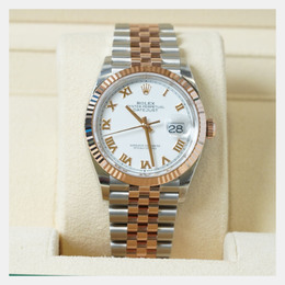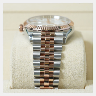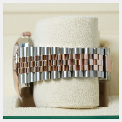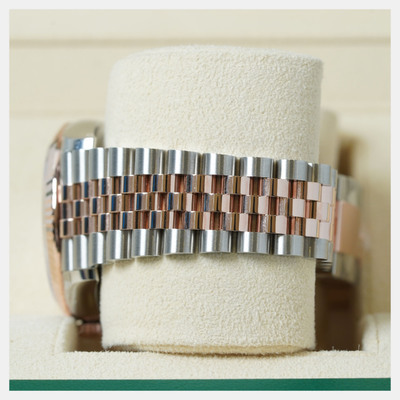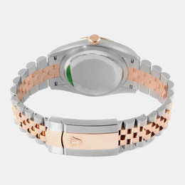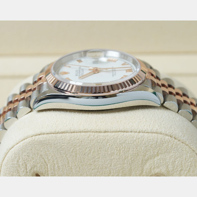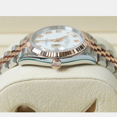 An automatic movement, white dial wristwatch for women in 18K Rose Gold Stainless Steel case with date functionality. Case size is approximately 36 mm.