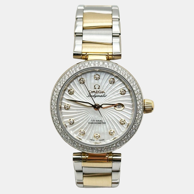 A certified Omega De Ville Ladymatic watch with a luminous mother of pearl dial, diamond hour markers, and elegant 18K yellow gold accents. Features automatic movement precision, is pre-owned, timeless sophistication, unisex design, and measures 34 mm in diameter.