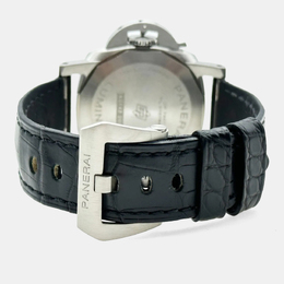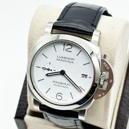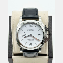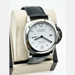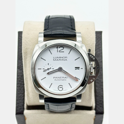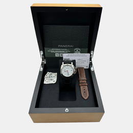 Signature Panerai design. Sleek stainless steel case measuring 40mm in diameter. Clean white dial providing a crisp appearance. Equipped with automatic movement for self-winding precision. This versatile timepiece offers timeless Italian style suitable for everyday wear and refined occasions.