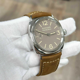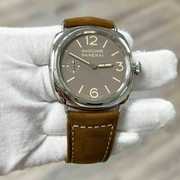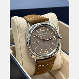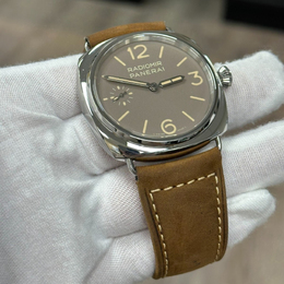 Certified pre-owned Panerai Luminor Officine. Features manual winding movement, brown dial, polished stainless steel case measuring 45mm in diameter, designed for men.