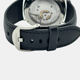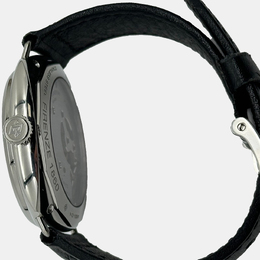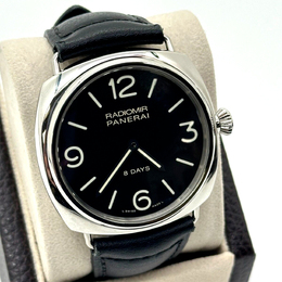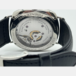 A tribute to Panerai's naval heritage features a spacious black dial, vintage-inspired cushion case design measuring 45mm in diameter, and a manual winding movement. This Certified Pre-Owned luxury watch combines classic Italian style with timeless military charm.