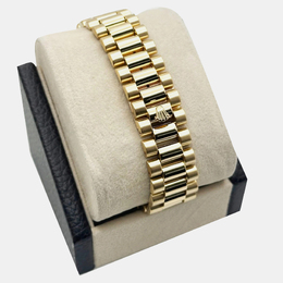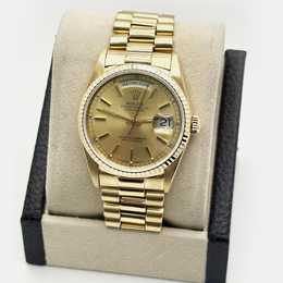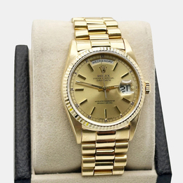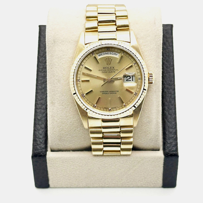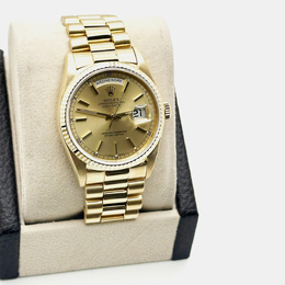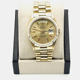 The Rolex Day Date, model President 18K Yellow Gold, features an automatic movement and a classic dial. It is sized at 36 mm and comes pre-owned. Crafted from 18K yellow gold for men.