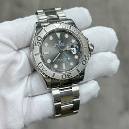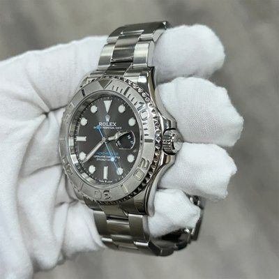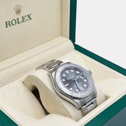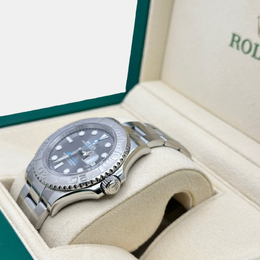 Sporty sophistication meets luxurious craftsmanship in the Rolex Yacht Master 126622. This men's automatic watch features a 40 mm case crafted from stainless steel and boasts a prominent platinum bezel. Its distinctive slate colored dial offers subtle elegance with its sophisticated grain finish, making it versatile for both nautical adventures and refined everyday occasions. Powered by an automatic mechanical movement, this timepiece delivers precise Rolex quality.