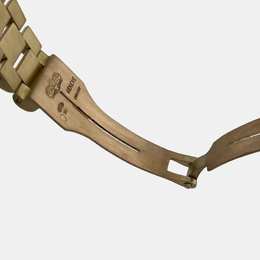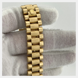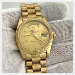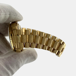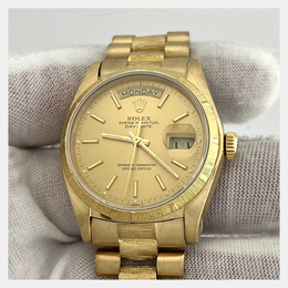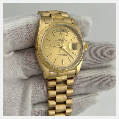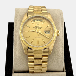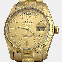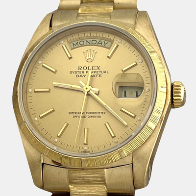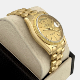 Pre-owned Rolex President Day Date model 18078. Features an elegant champagne dial, a solid 18K yellow gold case with polished finish, automatic self-winding movement ensuring precise timekeeping and accurate date display through the aperture at 3 o'clock, screw-down bezel ring set with diamonds (approx 46), sapphire crystal glass for clarity and scratch resistance, luminous hour markers and hands for enhanced readability in low light conditions, bracelet composed of yellow gold links with a folding Oysterclasp equipped with a safety release buckle.