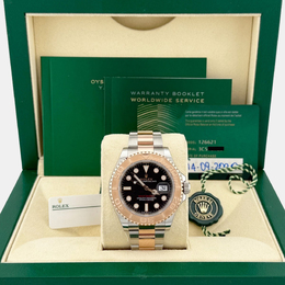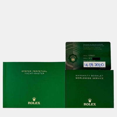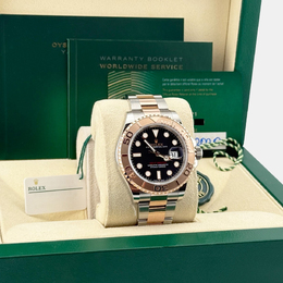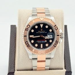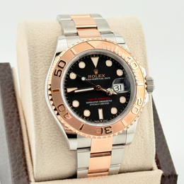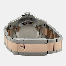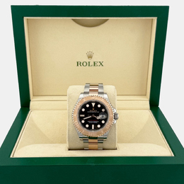 Rolex Yacht Master model 126621. This men's automatic wristwatch features a 40 mm stainless steel and rose gold case, complemented by an elegant black dial. It includes rose gold bezel insertions (specifically numbered component part 1221334) showcasing sophisticated design elements typical of the Yacht Master collection. The watch embodies Rolex's commitment to performance, timeless style, and exceptional craftsmanship.