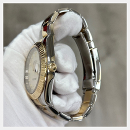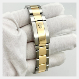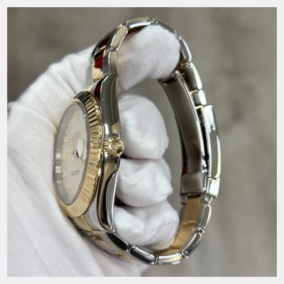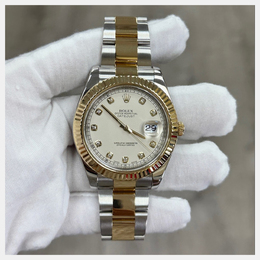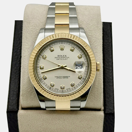 Men's Wristwatch featuring an automatic movement housed in a 41 mm stainless steel case with an 18K yellow gold bezel. The dial is crafted from ivory, adorned with diamonds. This pre owned timepiece offers reliable performance suitable for formal events, business settings, and elegant casual wear.