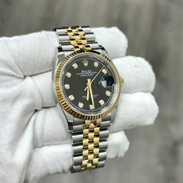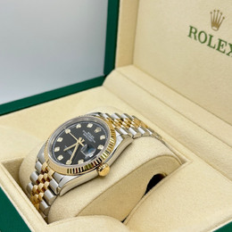 A classic men's wristwatch from Rolex featuring an automatic movement. Case is crafted in 18K yellow gold combined with a bezel set with black diamond markers. The deep black dial offers sophisticated contrast against the warm gold tones. Includes luminous hour markers and hands for enhanced readability, especially in low light conditions.