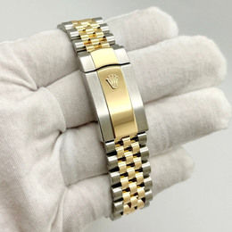 Clasp is likely Oysterlock with folding clasp for secure and comfortable wear on the wrist.