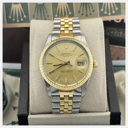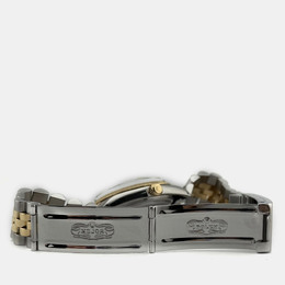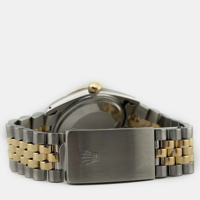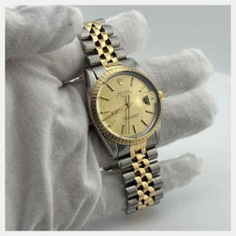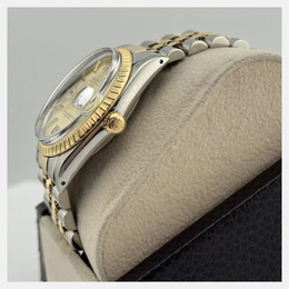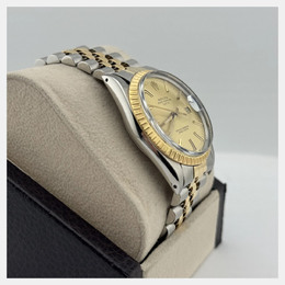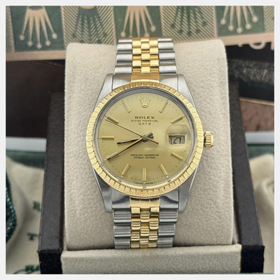 Rolex Date model 15053 with automatic movement. Case size is 34mm. Features an elegant champagne dial and a two-tone bracelet made of yellow gold stainless steel.