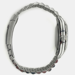 Automatic movement, black diamond dial with bezel accents, stainless steel case. Dramatic contrast, diamond details on both bezel and dial, captures light attention from every angle.