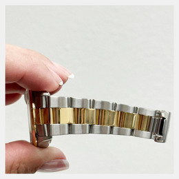 A silver dial automatic men's wristwatch featuring an 18K yellow gold and stainless steel case. Size is 34 mm. It has a refined, minimalistic design with subtle golden details for sophistication that isn't loud.
