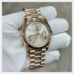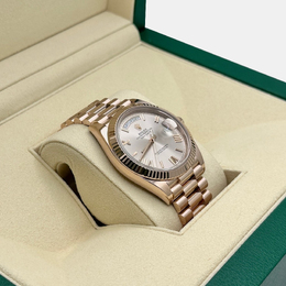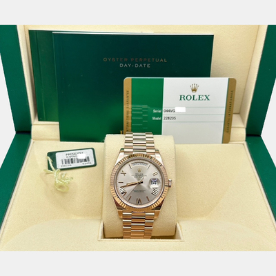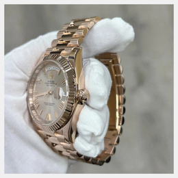 Men's automatic luxury wristwatch, model DD 228235. Features an 18K rose gold case and a stunning sundust dial finish. Includes date functionality at the three o'clock position and is powered by a self-winding mechanical movement (caliber MT5611). Meets timeless elegance with its 40mm diameter case suitable for men.