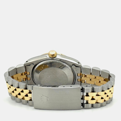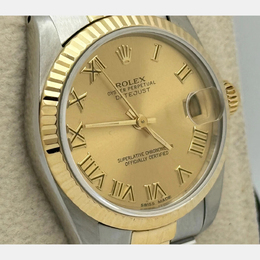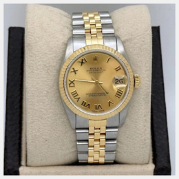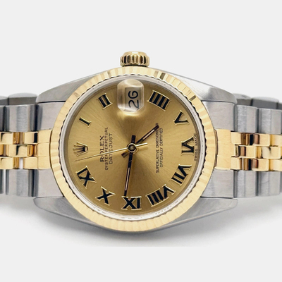 A pre-owned Rolex Datejust model 68273, featuring an automatic movement and a champagne dial. Case is crafted from 18K yellow gold with stainless steel elements; case size measures 31mm. This men's wristwatch exemplifies timeless taste and understated elegance suitable for business meetings or formal occasions.