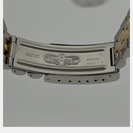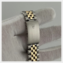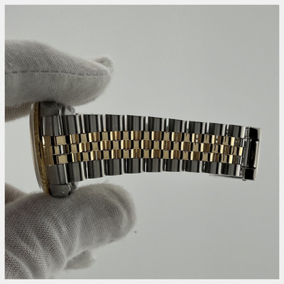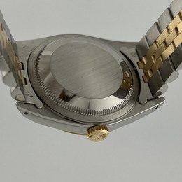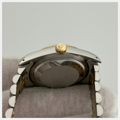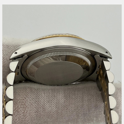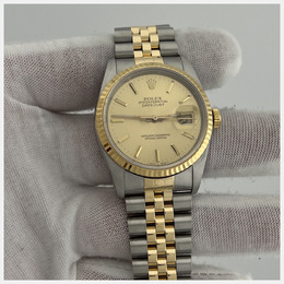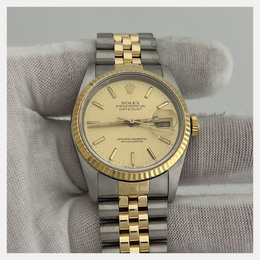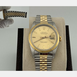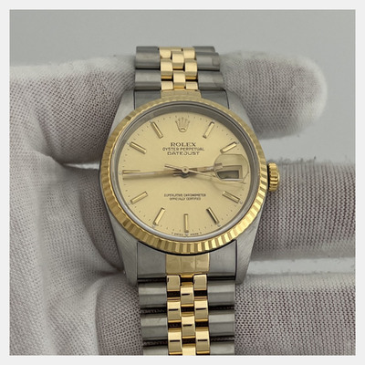 A pre-owned Rolex Datejust model 16233, featuring an elegant men's design. The watch boasts a 36 mm stainless steel case accented by an elegant champagne dial and a luminous bezel set in 18K yellow gold plating. It is powered by an automatic mechanical movement ensuring precise timekeeping. Known for its versatile style suitable for both professional settings and evening wear, this Datejust enhances any occasion with its classic yet refined appearance.