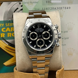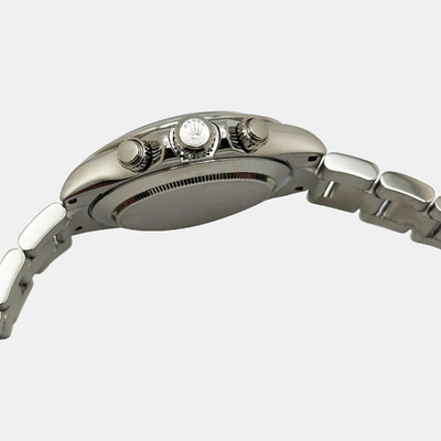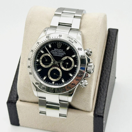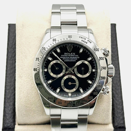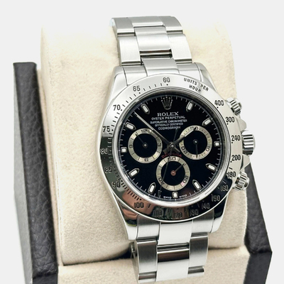 Automatic mechanical movement, Black stainless steel case with ceramic bezel insert marked 'Cosmograph', Classic men's chronograph wristwatch measuring 40 mm in diameter, Features a timeless design and technical legacy originating from racing circuits, The black dial contributes to its sleek appearance enhancing clarity under pressure while maintaining elegance.