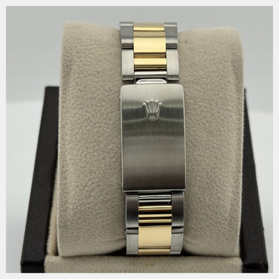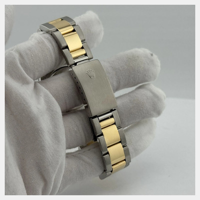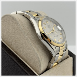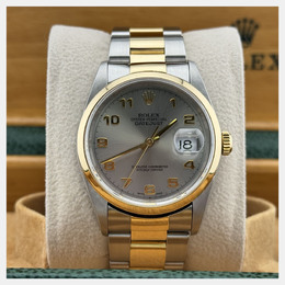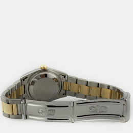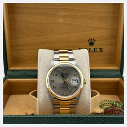 A pre-owned authentic men's Rolex Datejust (model 16203). This automatic wristwatch has a classic slate dial and an 18K yellow gold case combined with stainless steel. The case size is 36mm, equipped with the Caliber 126384 movement. Features an automatic mechanical movement, includes a scratch-resistant sapphire crystal glass face, date display at the 3 o'clock position, and comes fitted with its original or similar stainless steel Oyster bracelet and companion link in yellow gold. Suitable for professional use, formal occasions, and daily wear.