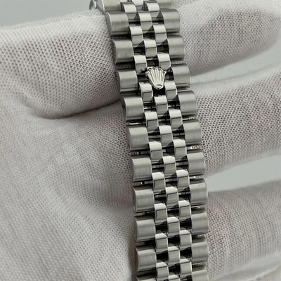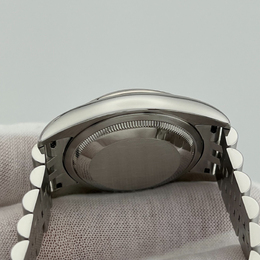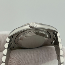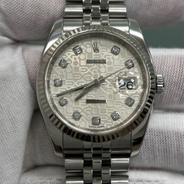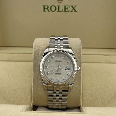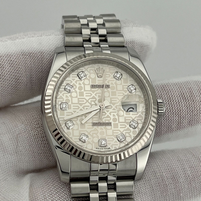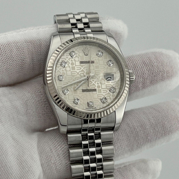 A luxury men's Rolex Datejust watch model 116234. Features an automatic movement, a 36 mm case crafted from stainless steel and 18k white gold. The dial includes diamond accents for added elegance. Known for its timeless sophistication, refinement, and exceptional craftsmanship.