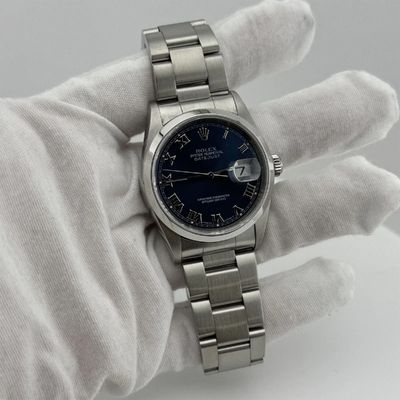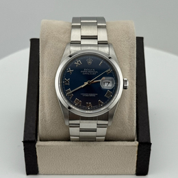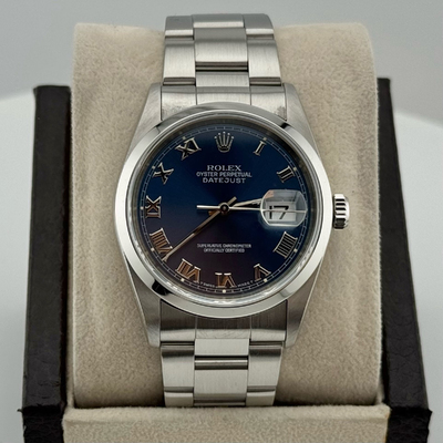 Automatic movement, Blue stainless steel case, Men's wristwatch, 36 mm diameter, Includes date function on the dial.