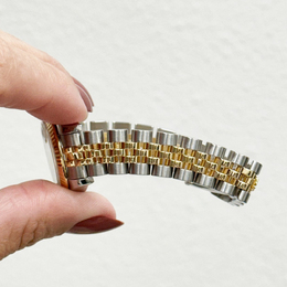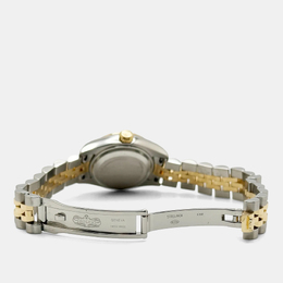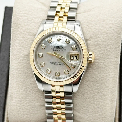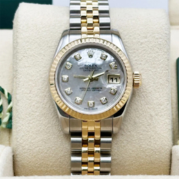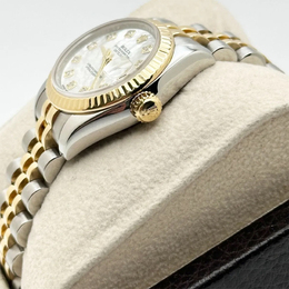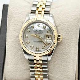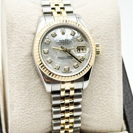 The Rolex President Datejust model 179173. Features a 26 mm case in 18k yellow gold and stainless steel. Equipped with an automatic mechanical movement. The dial is crafted from mother of pearl, accented by diamond hour markers for subtle radiance. This men's wristwatch has an elegant design embodyinging Rolex's enduring style.
