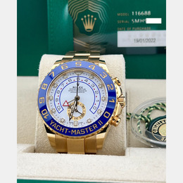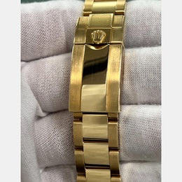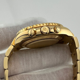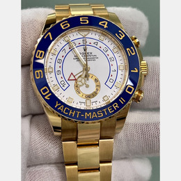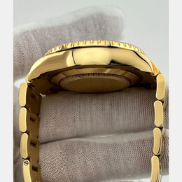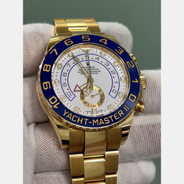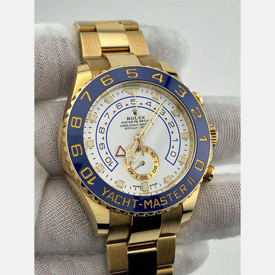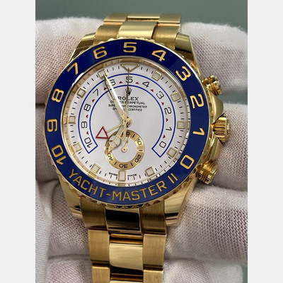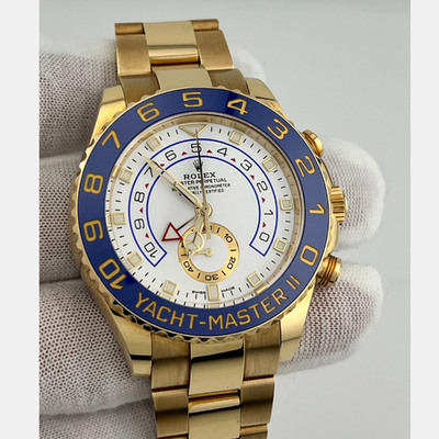 Automatic movement, ceramic bezel with blue insert, yellow gold case (18k), white dial, unidirectional rotating bezel, men's wristwatch, 44 mm diameter, sapphire crystal, date function visible through a small aperture on the 9 o'clock position, water resistance up to 100 meters which makes it suitable for swimming and snorkeling but not professional diving.