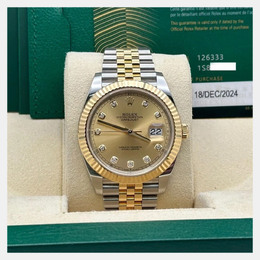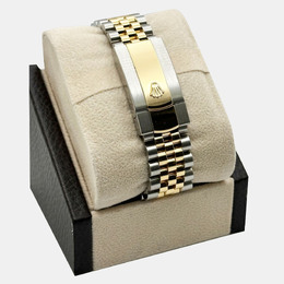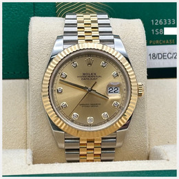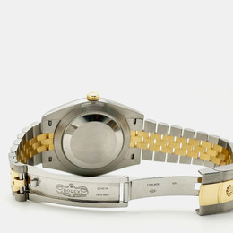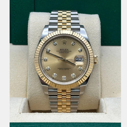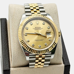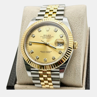 A two-tone watch featuring stainless steel and 18K yellow gold, having a champagne dial with diamond hour markers. Equipped with an automatic movement. Designed as a men's wristwatch measuring 41 mm in diameter.