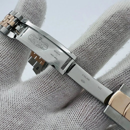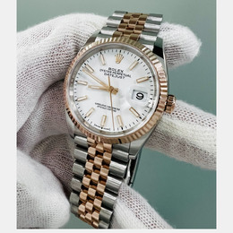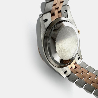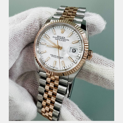 A clean white dial with an automatic movement, featuring an 18K rose gold-tone bezel and bracelet on a stainless steel case measuring 36 mm in diameter.