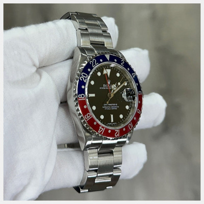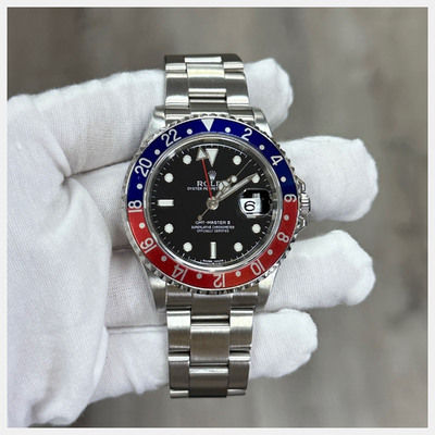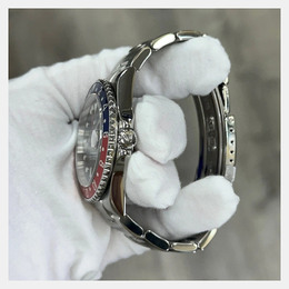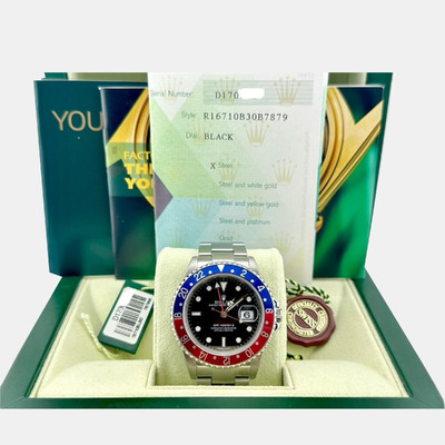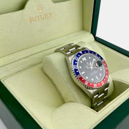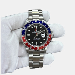 Men's wristwatch with stainless steel case measuring 40mm in diameter. Features a black dial displaying hours and minutes for both time zones. Powered by an automatic mechanical movement (caliber 3235). Comes equipped with a folding clasp bracelet made of Oysterlink stainless steel, allowing for dual time zone functionality via its patented Rotating Dual Time Ring bezel. Water resistant up to 100 meters or 330 feet.