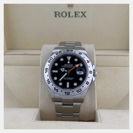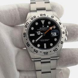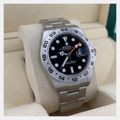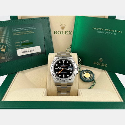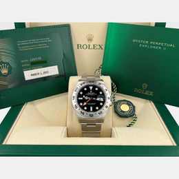 Durability features of this 42mm Rolex Explorer II (article number: 1222431) include a robust stainless steel case and bracelet. It is an automatic movement model equipped with a black dial and possesses a unidirectional rotating 24-hour bezel. Designed for travelers and adventurers.