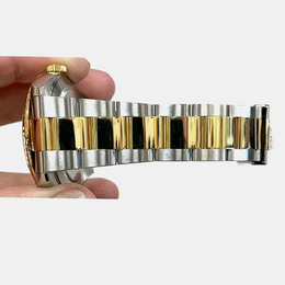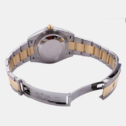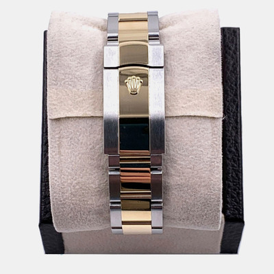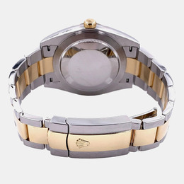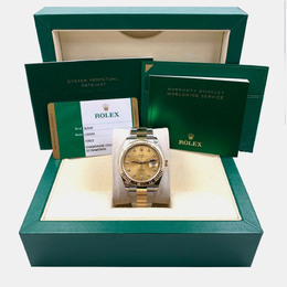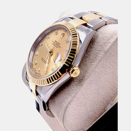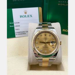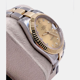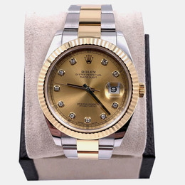 A Rolex Datejust model 126333 featuring an automatic mechanical movement. The watch includes a champagne colored dial enhanced with luminous diamond hour markers set within its face. It is housed in a 41mm diameter two-tone case constructed from stainless steel and accented with 18K yellow gold elements, specifically the bezel and clasp.
