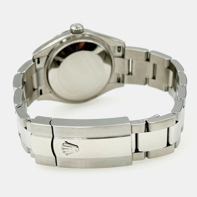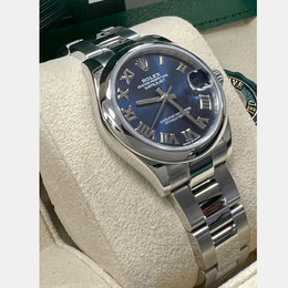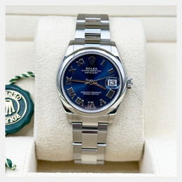 A women's Rolex wristwatch with an automatic movement and a blue stainless steel case measuring 31mm in diameter. The bright blue dial features clean markers. It includes the iconic Oyster bracelet.