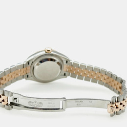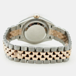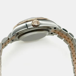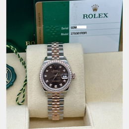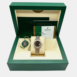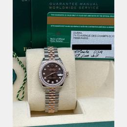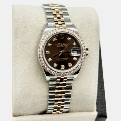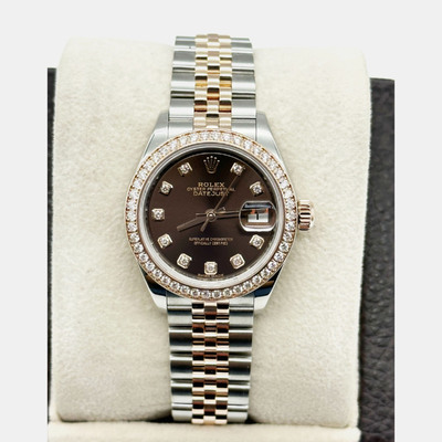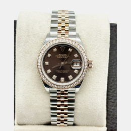 A Rolex Datejust watch model 279381 with a compact 28 mm case. Features an automatic movement and classic time display along with date functionality. Crafted from stainless steel and 18K rose gold materials, it boasts a chocolate dial and a two-tone appearance design.