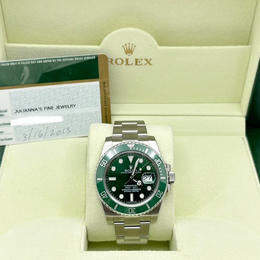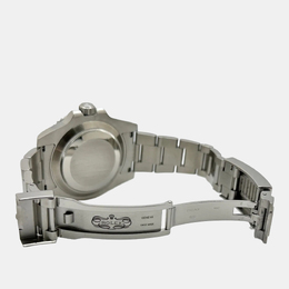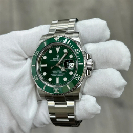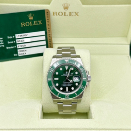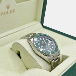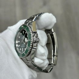 Case diameter measures 40mm (lugs around 21-22mm). Stainless steel Oyster bracelet includes concealed clasp with folding safety latch. Scratch-resistant green sapphire crystal protects the dial.