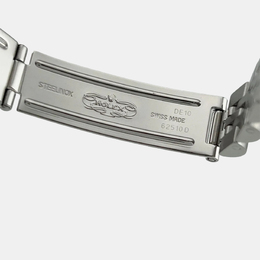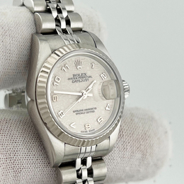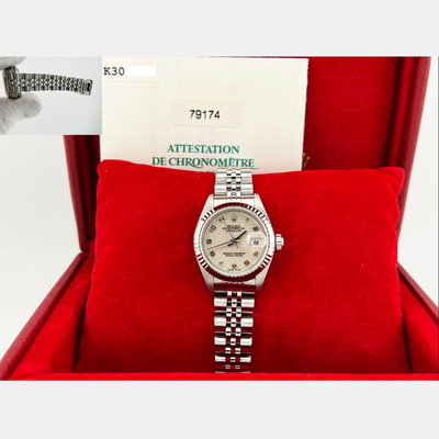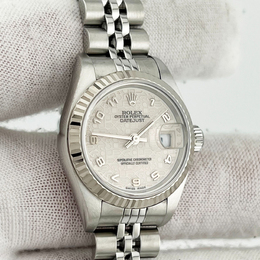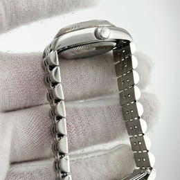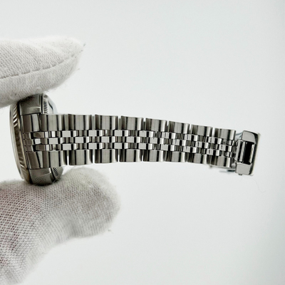 Automatic movement; stainless steel case with white gold bezel; 26 mm diameter; Rolex Caliber 3135 automatic chronometer certified movement; scratch-resistant sapphire crystal; luminous dial for easy reading; elegant and classic design suitable for professional or formal occasions.