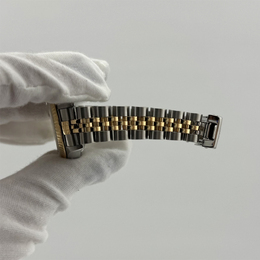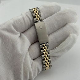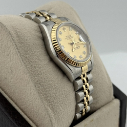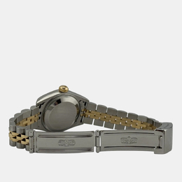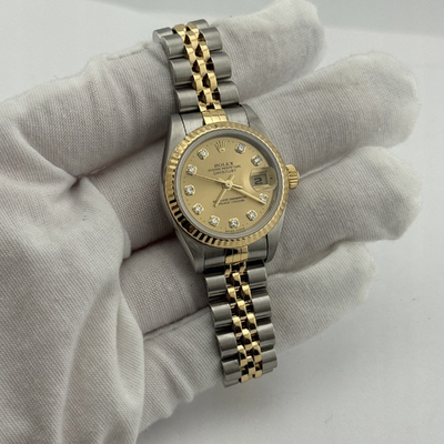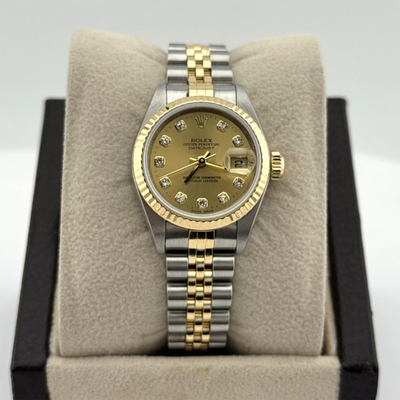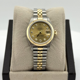 Women's wristwatch, model Datejust 79173. Automatic movement (caliber 3235). Case material: stainless steel measuring 26mm. Bezel and bracelet feature alternating yellow gold accents on a champagne-colored dial. Elegant design suitable for everyday wear or special occasions.