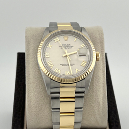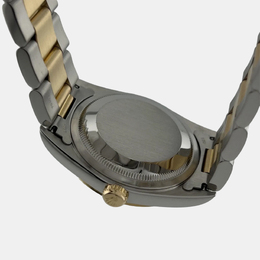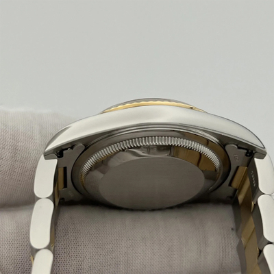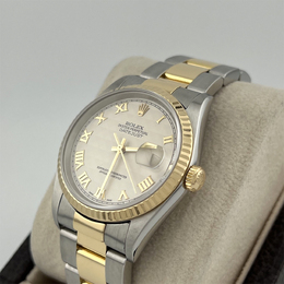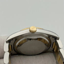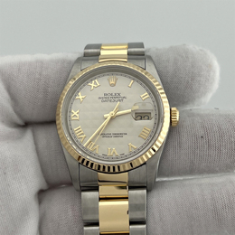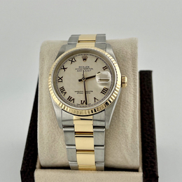 Automatically wound, features an ivory dial with soft patina and Roman numeral markers. Constructed from a harmonious blend of stainless steel and 18K yellow gold casing around a 36mm case size. Designed for men, offering both dignified presence and versatile wear suitable for contemporary style while embodyinging heritage elegance. Includes date display functionality.