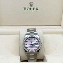 Rolex Datejust model 116234, automatic movement, features a mother of pearl dial accented by an 18K white gold bezel set with diamonds and stainless steel case and bracelet.