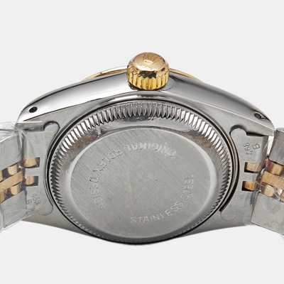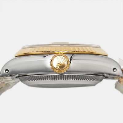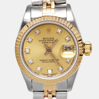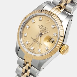 A women's automatic wristwatch featuring an 18K yellow gold and stainless steel 26 mm case. It includes a radiant champagne dial accented by diamond hour markers, a signature fluted bezel, and a Jubilee bracelet.
