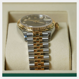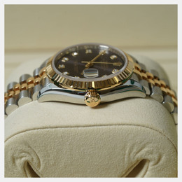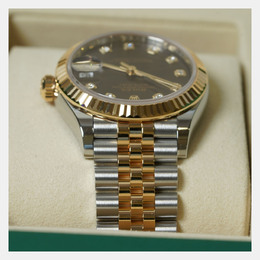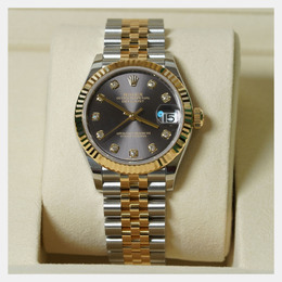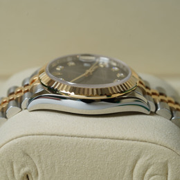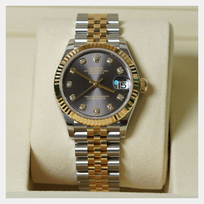 A women's automatic wristwatch from Rolex. Reference: 278273-0022. Features a dark grey dial accented with diamond markers and yellow gold elements. Case material is stainless steel with an 18K yellow gold finish. Movement type is automatic. Diameter measures 31 mm, coded as model number 1220924.