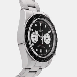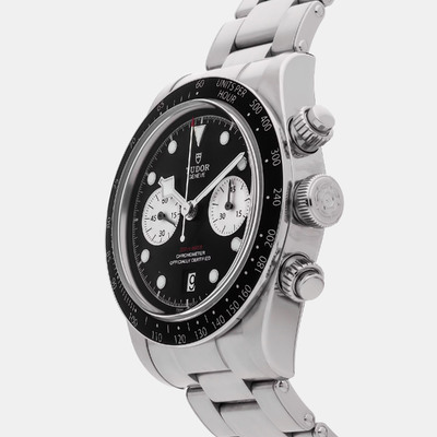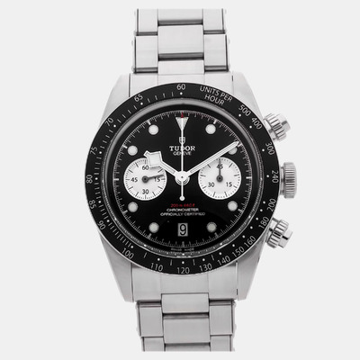 This Tudor Black Bay Chronograph features a robust steel case measuring 41mm in diameter. It includes a COSC-certified automatic chronograph movement providing precise timekeeping with stopwatch functionality. The iconic panda style dial offers excellent readability, complemented by luminous markers and hands for low-light conditions. This model comes equipped with screw-down crown jewels and is finished to a high standard suitable for everyday wear. Rated at 200 meters of water resistance, it ensures durability during various activities.