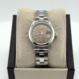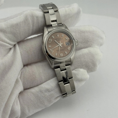 A charming and feminine 26 mm Rolex Datejust features a rare pink salmon dial encased in a sleek stainless steel bracelet. Automatic movement, classic design.