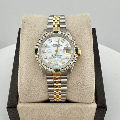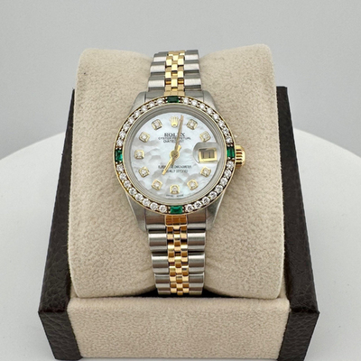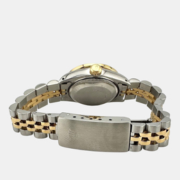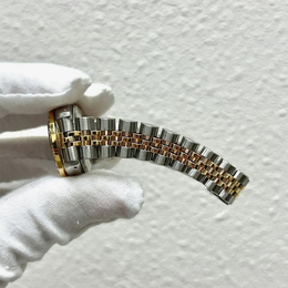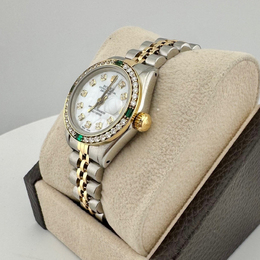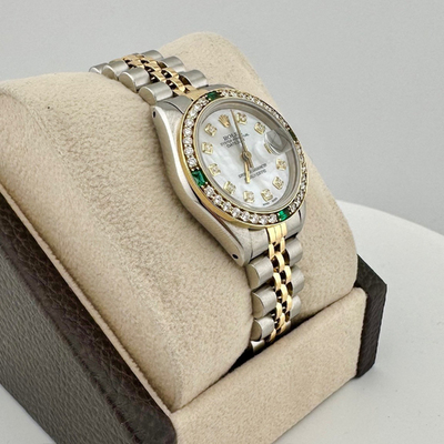 Air King water resistance rating: 100 meters. Luminous white mother of pearl dial. Diamond set bezel and folding clasp tongue. Case crafted from 18k yellow gold and stainless steel. Case diameter measures 26 mm. Automatic mechanical movement with Caliber 3235. Date display at the 3 o'clock position. Sapphire crystal transparent caseback displaying the movement. Includes original box and papers (if applicable).