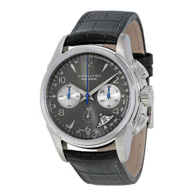 A Hamilton Jazzmaster Automatic Chronograph for Men. Features a stainless steel case with black croco-embossed leather strap, fixed stainless steel bezel, and a grey dial equipped with luminous hands and alternating Arabic numeral/index hour markers including a prominent tachymeter scale around the outer rim. Includes date display between 4 and 5 o'clock, chronograph sub-dials for seconds (0-60), minutes (0-30) and hours (0-12). Powered by an automatic self-winding movement with scratch resistant sapphire crystal. Comes with a skeleton case back. Case dimensions: diameter 42mm, thickness 15mm. Equipped with tang clasp and is water resistant up to 100 meters / 330 feet.