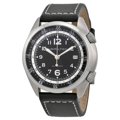 Stainless steel case, black leather strap. Fixed stainless steel bezel. Black dial featuring luminous hands and Arabic numeral hour markers with 24 hour subdials. Minute markers around outer rim. Analog dial type. Luminescent hands and markers. Date display at the 3 o'clock position. Automatic movement providing an 80-hour power reserve. Scratch resistant sapphire crystal. Skeleton case back design. Case diameter measures 41mm, thickness is 12.7mm. Round shaped watch face. Band width of 22mm equipped with a tang clasp mechanism. Water resistant up to 100 meters / 330 feet depth suitable for recreational diving.