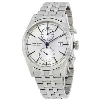 Hamilton H32416981 American Classic Spirit Liberty Chronograph Men's Watch, 42mm stainless steel case with a stainless steel bracelet, fixed bezel, sapphire crystal, automatic movement with 60-hour power reserve, chronograph function (two sub-dials for seconds and hours), date display at the 3 o'clock position, analog dial featuring grey hands and index hour markers against a silver background, minute markers on outer rim, scratch resistant sapphire crystal, fold over clasp with safety release, water resistant up to 50 meters / 165 feet, round shape, Swiss Made.