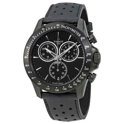 Black PVD stainless steel case with a black perforated leather strap, fixed black PVD bezel showing tachymeter markings, black dial featuring luminous silver-tone hands and index hour markers, minute markers around the outer rim, analog dial type with luminescent hands and markers at 6 o'clock position date display, chronograph function including three sub-dials for 60 second, 30 minute, and tenths of a second, Tissot Calibre G10.212 quartz movement, scratch resistant sapphire crystal glass, solid case back, round shape measuring 42.5 mm in diameter with thickness 11.22 mm, strap width is 20 mm secured by a tang clasp mechanism, water resistance up to 100 meters or 330 feet depth equivalent, includes chronograph tachymeter date hour minute second functions, labeled as Luxury watch style constructed with Swiss Made components.