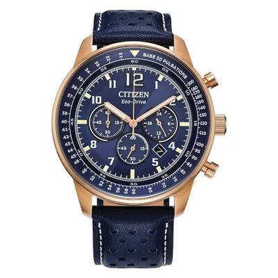 Japanese made Citizen Eco-Drive chronograph watch for men. Features an analog dial with blue color, rose gold-tone hands and index hour markers. Includes minute markers around the outer rim. Luminescent coating on the hands and markers ensures visibility in low light conditions. Date display located between 4 and 5 o'clock position.
