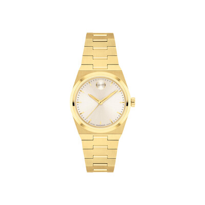 Yellow gold-tone stainless steel case. Fixed yellow gold-tone bezel. White dial features index hour markers and yellow gold-tone hands. Minute markers around the outer rim. Analog dial type with seconds subdial visible through the center aperture. Quartz movement ensures precise timekeeping. Solid case back. Round case shape measuring 28 mm in diameter. Secure fold over clasp equipped with a safety release mechanism. Water resistant to 50 meters / 165 feet, suitable for shallow water activities and everyday wear exposure. Functions include hour display, minute display, second display via central seconds hand. Classic ladies' sport watch design.