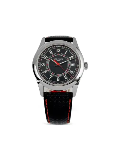 Brand: Patek Philippe. Model Name: Calatrava. Reference Number: 32302098. Case Size: 40mm. Case Material: White Gold (Yellow Gold). Case Shape: Round. Dial Color: Black featuring red accent elements and date window. Strap Type: Genuine Leather strap. Movement Type: Automatic Mechanical movement, Calibre 32-2/4/6. Condition Rating: EXCELLENT. Item condition is near-perfect with no damage or signs of use. Watch has been evaluated, authenticated, and approved by WRIST AFICIONADO watchmakers. Includes original manufacturer box and all accompanying original papers.