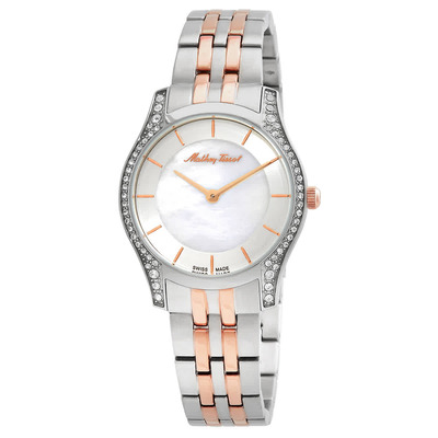 Silver-tone stainless steel case, two-tone (silver-tone and rose gold-tone) stainless steel bracelet. Fixed bezel set with silver-tone zirconia stones. Mother-of-pearl dial accented by rose gold-tone slender hands and luminous index hour markers. Analog quartz movement from Ronda Caliber 762. Protected by scratch-resistant mineral crystal. Equipped with a pull/push crown for setting time. Features a solid case back. Classic round shape measuring 32 mm in diameter. Secured with a fold-over clasp containing safety release mechanism. Water resistant up to 50 meters (165 feet). Includes functions for displaying hours and minutes.